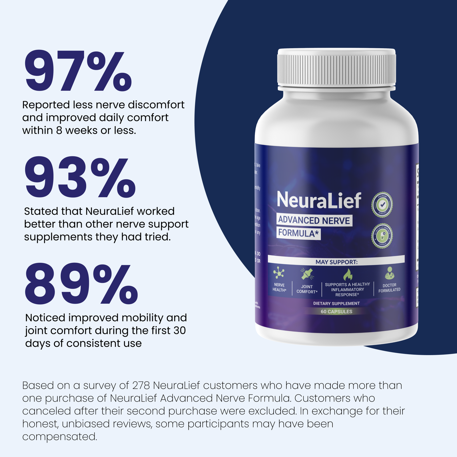 Individual results may vary. Some people notice changes in comfort or relaxation within the first few weeks, while others experience more gradual benefits with consistent daily use. NeuraLief is intended to support long-term nerve health rather than provide instant effects.